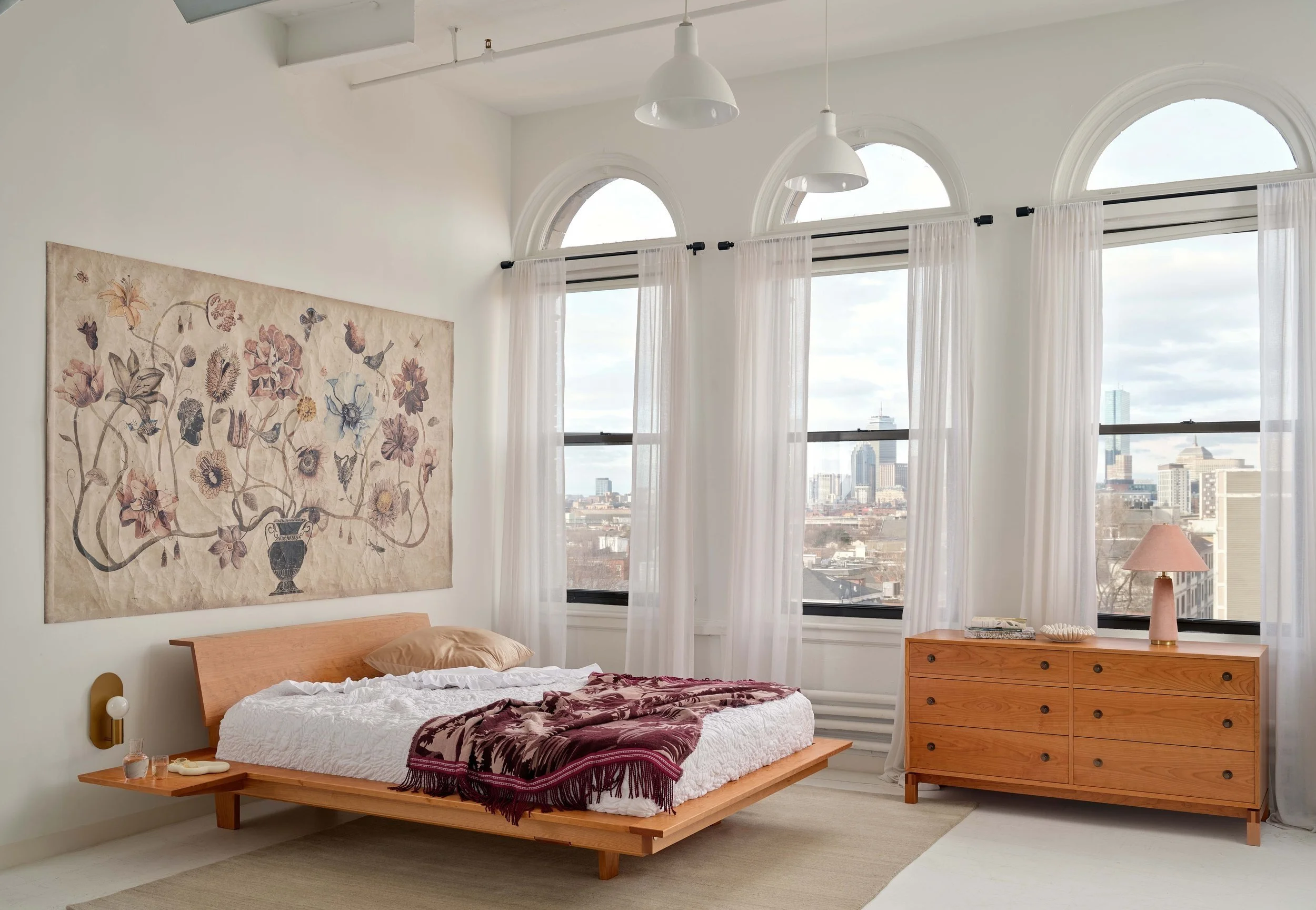 The holiday 2024 Thos. Moser catalog celebrates New England's long and rich heritage in textile manufacturing. Photographed in the historical Bates Mill in Lewiston, ME, the catalog features a new bedroom collection bearing the Bates name, whose spindles were inspired by weaver's spools.
